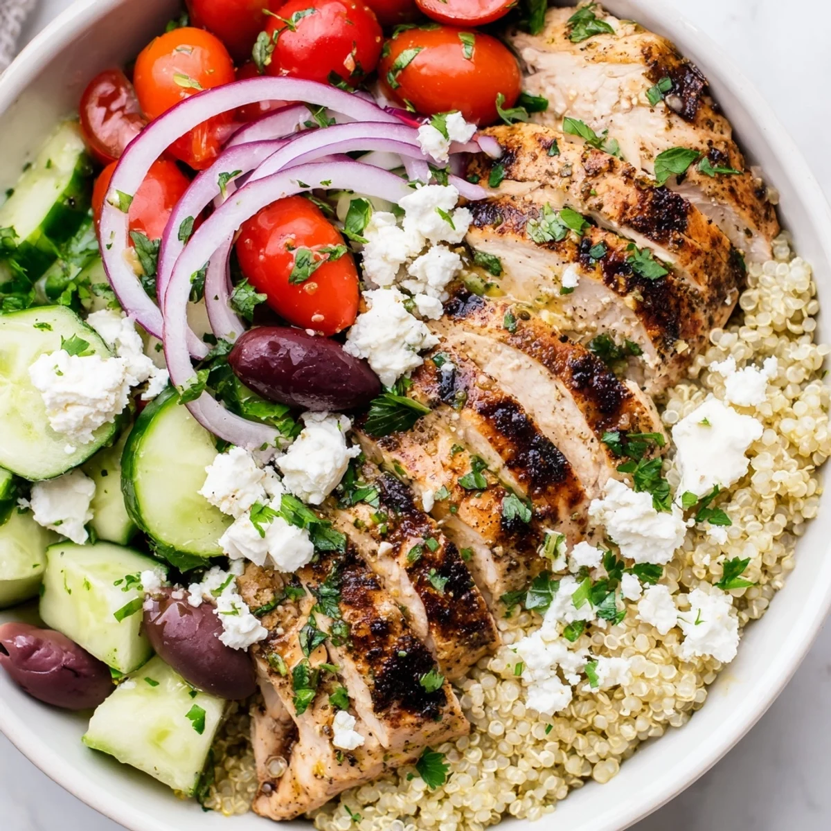 - Divide the quinoa among four bowls and arrange the sliced chicken, tomatoes, cucumber, red onion, olives, and feta on top. Drizzle with the dressing and scatter fresh parsley over everything.
