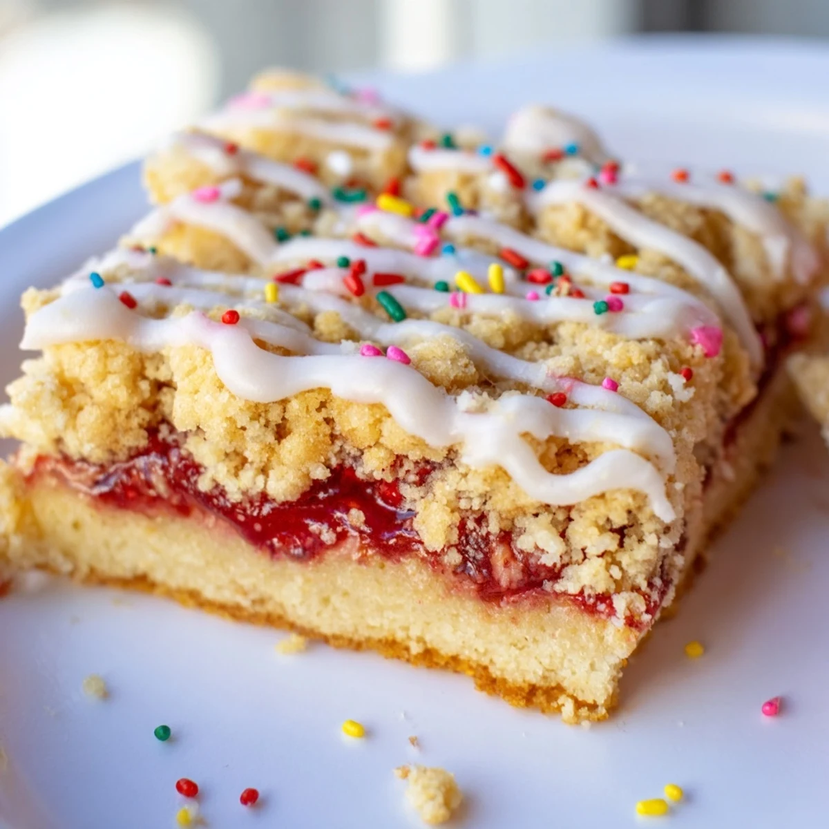 The smell of strawberry jam bubbling in the oven still takes me back to rainy Sunday afternoons when my mom would let us raid the pantry for sprinkles. These bars capture that same cozy magic—buttery cookie crust, sweet jam center, and that iconic glaze that makes everything feel like a celebration. I started making them for office potlucks and now they are the most requested item every single time.